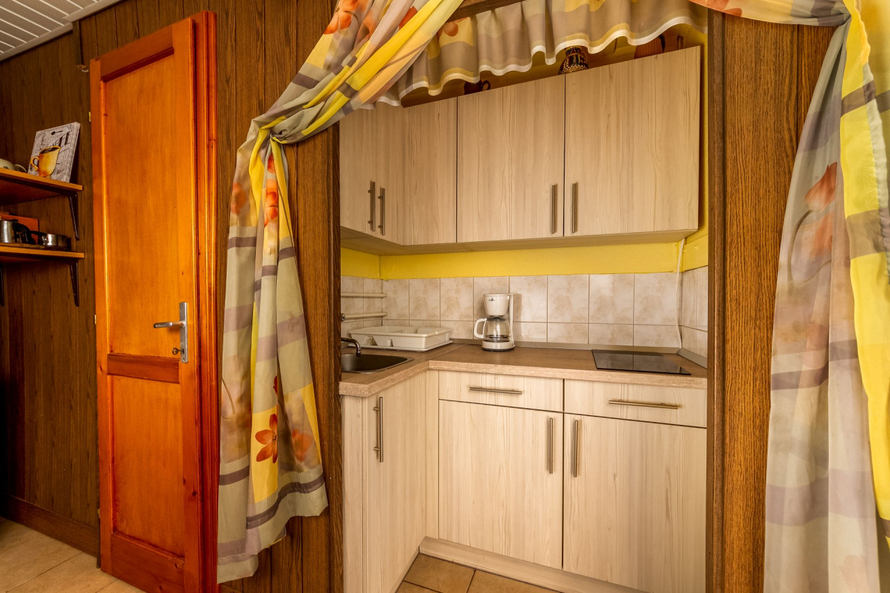 Földszint: Nappali főző- és étkezősarokkal, két kétágyas szoba, zuhanyzó/WC, fedett terasz.