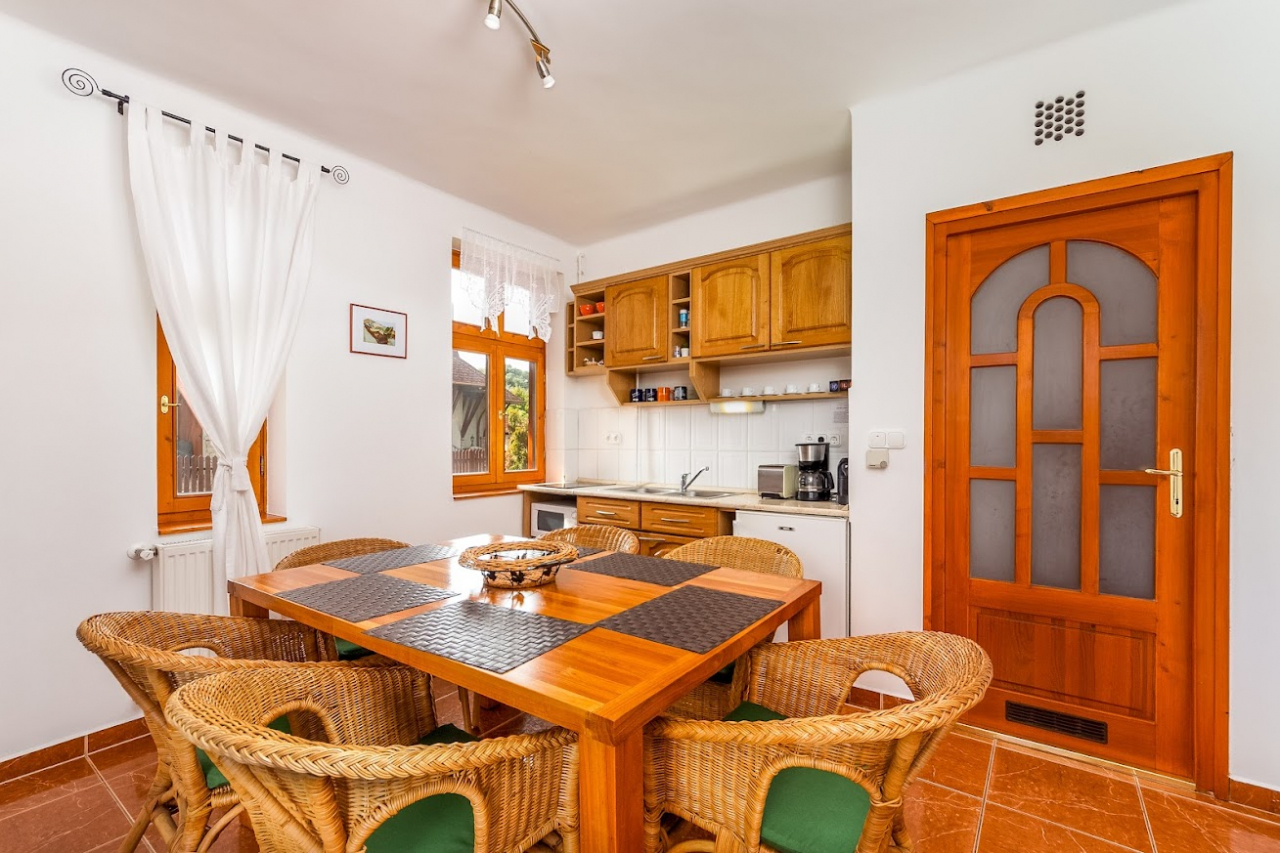 Földszint: Nappali főző- és étkezősarokkal, fürdőszoba, WC, egy kétágyas szoba, fedett terasz.